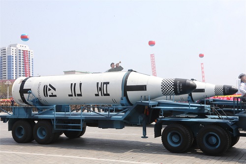 4月15日在朝鲜首都平壤举行的阅兵式上拍摄的“北极星—2”型潜射中程弹道导弹。