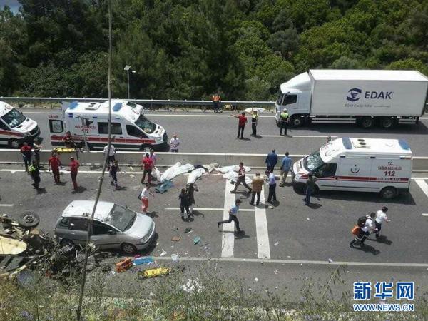 这是5月13日在土耳其西南部穆拉省拍摄的事故现场。土耳其西南部穆拉省13日发生旅游巴士坠崖事故。事故已造成20人死亡、11人重伤。 新华社发