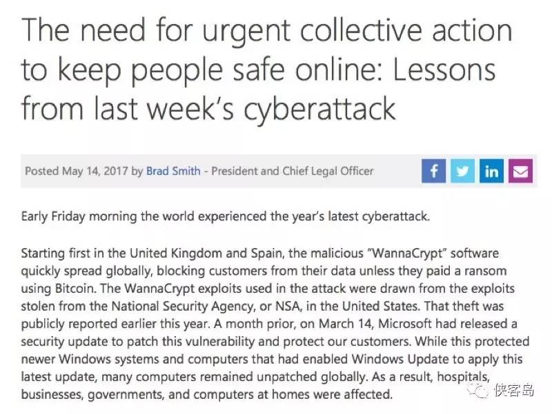 对此,微软总裁Brad Smith也在自己的博客上愤怒地说,“如果这些政府部门继续躲在暗处挖掘全球电脑系统的漏洞,然后制成所谓的’武器库’用来攻击别国或是’买卖’,那么你们就是网络犯罪的帮凶!”