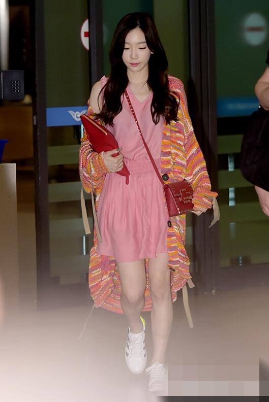 当日,泰妍身穿粉色连衣裙外搭一件橘色系针织衫现身机场,搭配的小白鞋、红色包包尽显青春活力,元气满满。