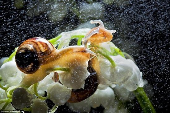来自美国的摄影师Suren Manvelyan邀请了两位软体动物到他的工作室拍照。摄影师用水枪模拟雨天。增加特殊的灯光效果,光线可以透过蜗牛的壳使整个身体发亮。