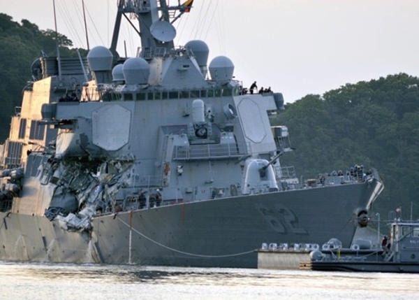 据海外网6月23日电,美国海军第七舰队“菲茨杰拉德”号驱逐舰上周六(17日)在日本东京附近海域航行时,被一艘菲律宾货柜船拦腰碰撞,造成7名船员死亡。美媒指船员当时为防止军舰沉没,只好关上水密门,令7名船员困在入水的船舱并活活淹死。另有美媒刊登了“菲茨杰拉德”号被撞后的内部情况,可见属于舰长本森的船舱严重损毁。