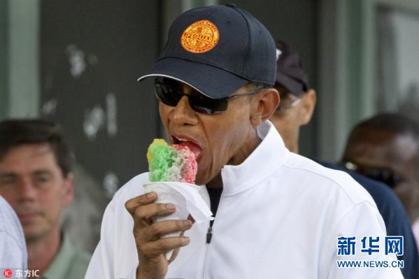 当地时间2015年1月1日,美国夏威夷Kailua,美国总统奥巴马新年首日在夏威夷度假,携女儿在街头吃刨冰。