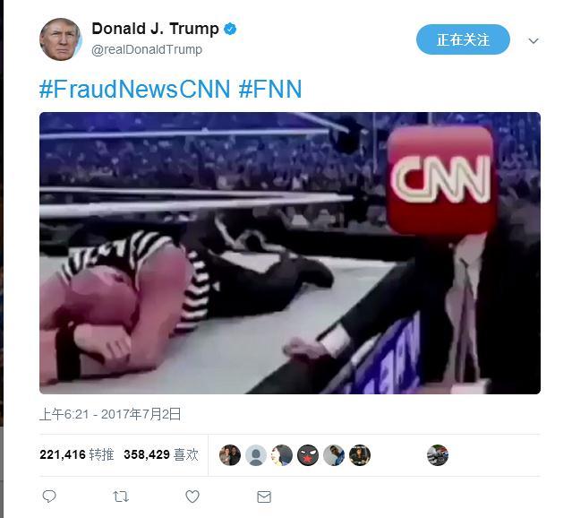 【环球网综合报道】美国总统特朗普周日(7月2日)在推特上传一段长约28秒的恶搞视频,片中他把一名头部被“有线电视新闻网”(CNN)标志遮住的男子摔倒在地,然后向对方连续出拳。在视频快结束时,画面右下角还出现一个影射CNN的假标志“FNN”,讽刺该电视台是“骗子新闻网”。特朗普还在推特上附文:“#假新闻CNN”。截至环球网记者发稿前,该推特已经获得36万次点赞,22万次转发和11万则留言。