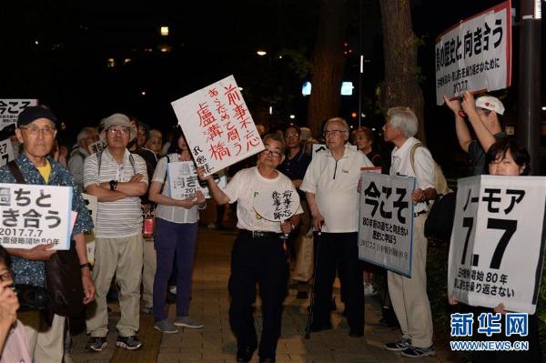 7月7日,东京市民在日本国会前手举标语集会。当日,日本东京市民团体百余人举行集会,纪念“七七事变”80周年,演讲痛斥日本军国主义对于中国人民犯下的累累罪行,呼吁日本政府正视历史,不要重蹈覆辙。新华社记者马平摄