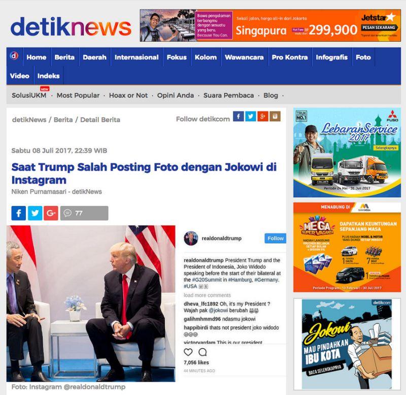 特朗普的Instagram官方账号有710万追随者,这样的低级失误很快就被眼尖的网友发现并提醒改正。虽然很快改了过来,但这个错误仍然很快就传遍了印度尼西亚媒体。