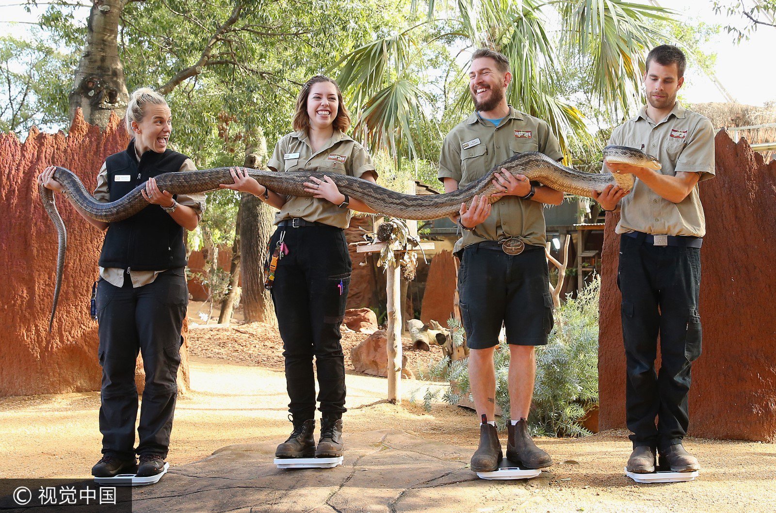 当地时间2017年7月14日,澳大利亚悉尼,饲养员在给一条名叫Big Ronny的蛇称重。饲养员还将在16号世界蛇日当天为这条5米长的20岁的蟒蛇做年度健康检查。