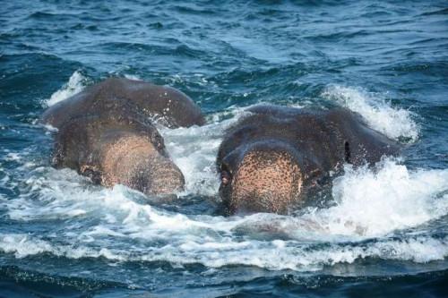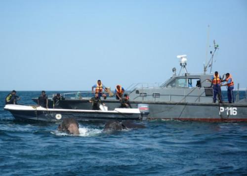 军方与野生动物部门连手合作,展开一场海中救象的行动。在众人的努力下,救援团队成功用绳索绑住幼象,并把它们拉回接近岸边的位置。