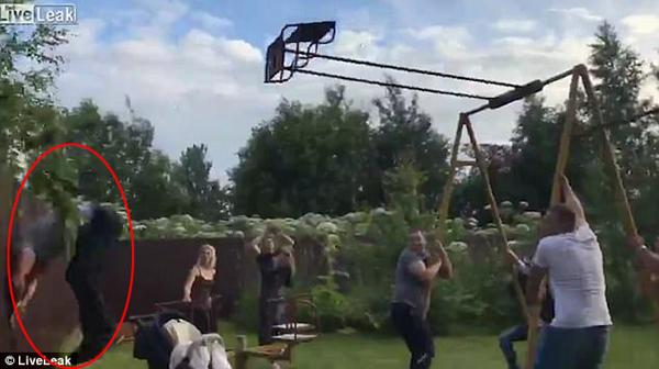 该小伙摆动秋千,然后摆到一定速度之后旋转360度转了几圈,但最后发现自己难以控制加速后的秋千。他整个人重重地掉了下来,脖子撞上木栅栏并摔倒在地上。
