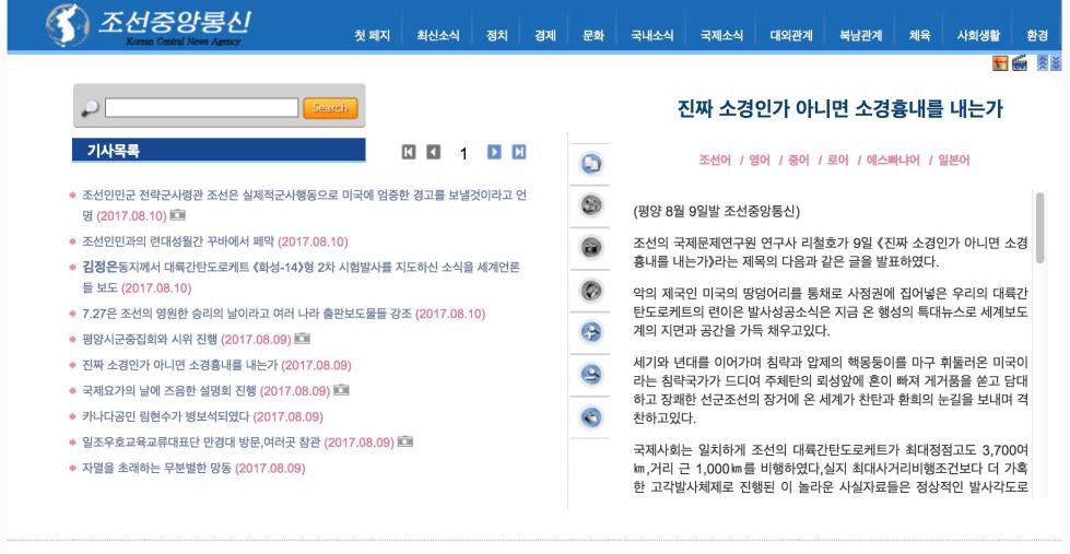 9日,在发布朝鲜人民军战略军司令官金络谦大将声明,详细公开朝鲜用弹道导弹攻击美国关岛的计划后,朝中社再次发表朝鲜国际问题研究院研究员李哲浩署名文章,批评俄罗斯“否认”朝鲜弹道导弹取得的成果。
