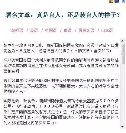 这篇名为《真是盲人,还是装盲人的样子?》的文章称,在“国际社会一致表示,朝鲜洲际弹道火箭飞行最大高度为3700多公里,飞行距离为近1000公里”的情况下,“唯独俄罗斯视而不见、听而不闻,百般抵赖否认。”