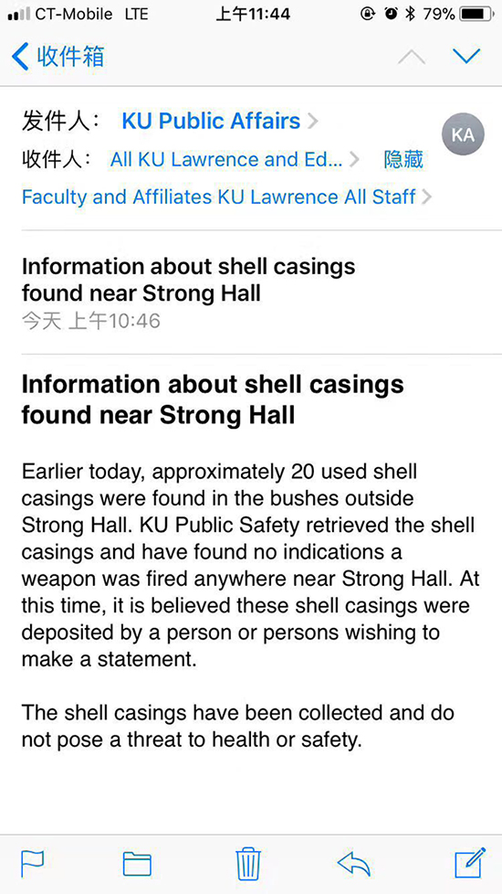 这则信息是由当地时间2日早上由学校以电子邮件形式发送给各位学生的。堪萨斯州当地媒体Wibw2日也报道了这一消息。