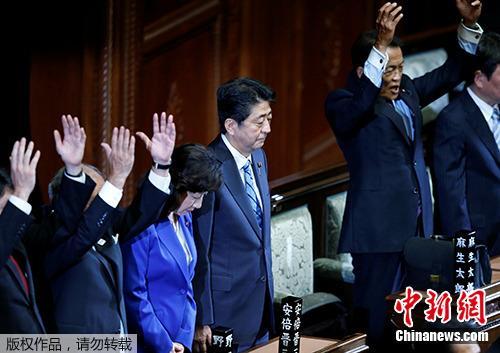 资料图:当地时间2017年9月28日,日本首相安倍晋三宣布解散众议院后,多名内阁成员举手欢呼。