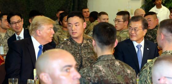 韩联社称,根据韩国总统府青瓦台公布的内容,文在寅同特朗普等用餐时表示,今天是历史性的一天,这是韩美两国总统有史以来首次为慰问韩美官兵而访问驻韩美军基地。他还说,危难时刻见真情,驻韩美军是在韩国最困难的时刻流血牺牲并肩奋战的真朋友,是韩美同盟的坚实基石和未来希望。