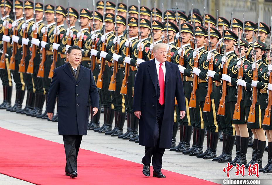 11月9日上午9时许,习近平在北京人民大会堂东门外广场举行仪式欢迎特朗普访华,随后与特朗普举行会谈。图为习近平和特朗普检阅仪仗队。中新社记者 毛建军 摄