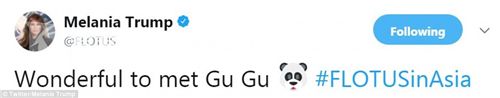梅拉尼娅对北京动物园的大熊猫“古古”印象深刻,并在11日在推特上公布了她亲自喂食“古古”以及抚摸其爪子的照片,称“见到古古太美妙了”。
