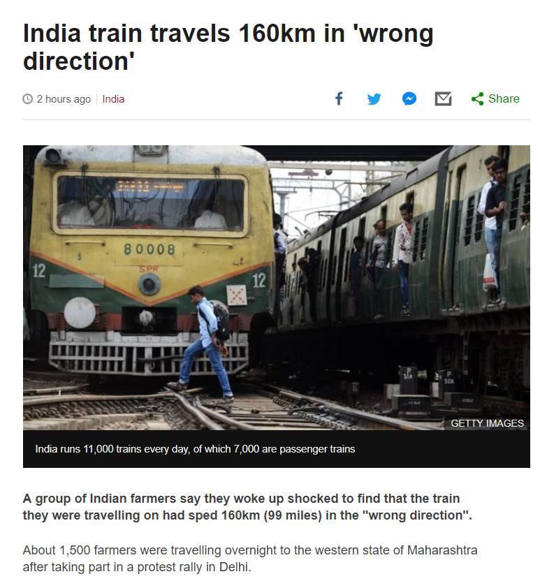 一群印度农民最近搭乘火车时遇上一件稀奇的事:他们本来乘着夜班火车回家,没想到一觉醒来,却发现这列火车已经朝错误的方向开了160公里,而 列车上的工作人员浑然不觉 。