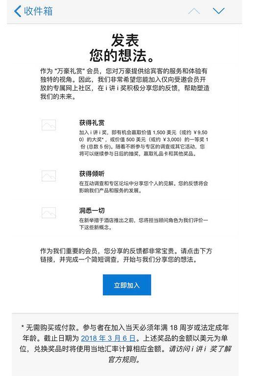 事情的详细经过是这样的:今天早上,不少万豪酒店集团的中国会员收到了一封集团方面发来的电子邮件,邀请他们参加一个名为“i讲i奖”的有奖调查问卷活动。