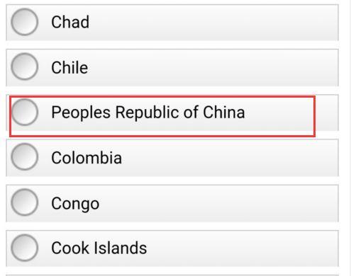 可是,有参与了这个英文有奖问卷活动的网友发现,英文版给出的国家列表中却不仅没有西藏,就连港澳台也都不在上面,名单上涉及中国的只有一个“People’s Republic of China”(即“中华人民共和国”)。