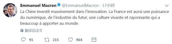 △译文:“中国在创新领域投资巨大。法国也是一个数字化和未来产业的发展强国,一个活跃而耀眼、能令世界收益颇丰的文化大国。”