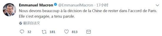 马克龙总统感谢中国在巴黎协议中所起的重要作用。