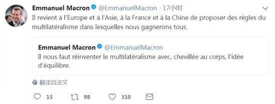 △译文:“现在轮到欧洲和亚洲、法国与中国来制定多边主义的规则,这将使我们实现共赢。”