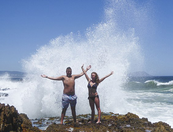 据了解,来自英国莱斯特郡的马丽莱兹(Marelize)和丈夫瑞恩?德雷尔(Ryan Dreyer)刚刚新婚,他们将蜜月旅行的地点选在了南非。在南非赫曼努斯的一个海滩上,他们在海浪到来时摆出很酷的姿势拍照。但不幸的是,在巨浪的冲击下,他们被打入水中,并且马丽莱兹的腿被困在了两块石头之间,丈夫瑞安虽然迅速帮她把腿弄出来了,但是马丽莱兹的腿却骨折了。好在身为理疗专业毕业生的她知道用拖鞋为自己做一个固定夹板。最后,在她姐姐和朋友的帮助下,他们被及时送到了医院进行治疗。