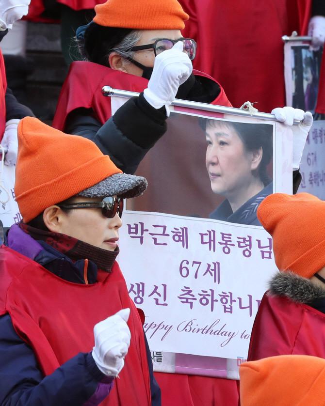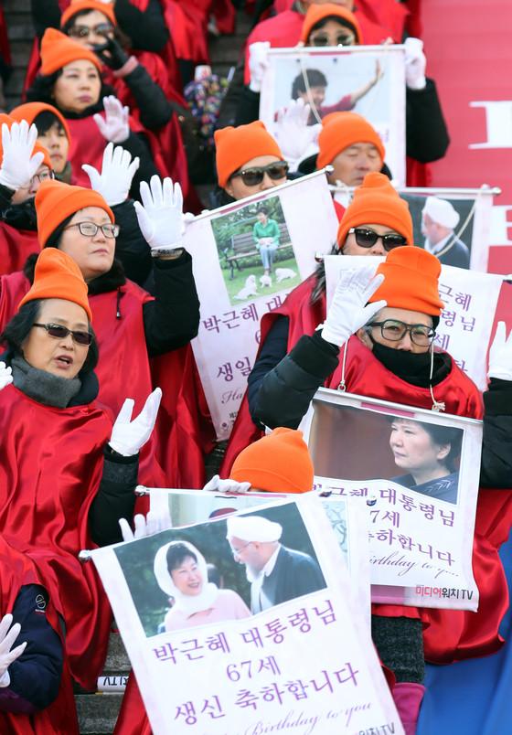 据韩联社等报道,在集会现场,朴槿惠的铁粉们拉起巨大横幅,上面用英韩双语写着“庆祝生日快乐”等祝语。他们还摆出蛋糕。有大叔大妈手举印有朴槿惠照片的海报,高呼口号,情绪激动。