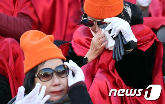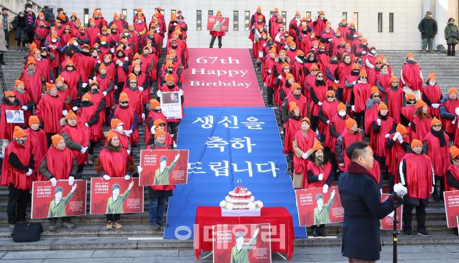 海外网2月1日电 明天(2日)将迎来韩国前总统朴槿惠的67岁生日。1日下午,有韩国保守团体在首尔钟路区世宗文化会馆前集会,为“偶像”朴槿惠提前庆生。他们头戴黄帽身着红色披风,高呼口号。不少韩国大妈情绪激动,现场抹起眼泪。