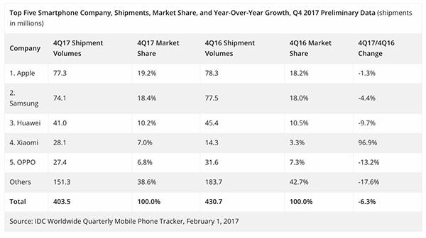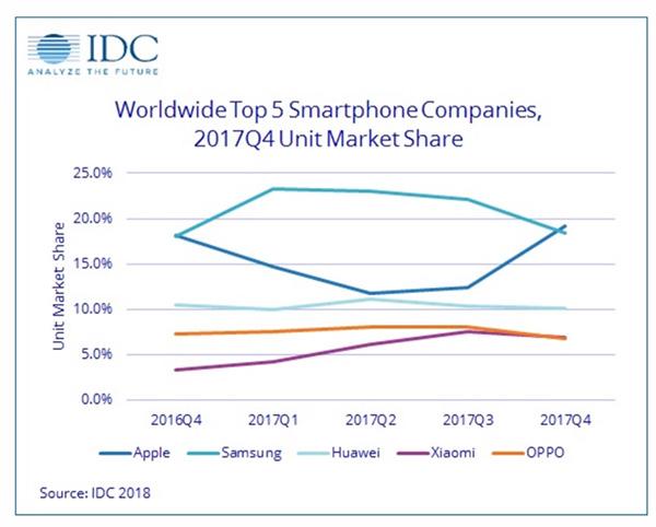 2月2日,市场研究公司IDC于发布报告称,在2017年第四季度,苹果超越三星成为全球智能手机销量之王。在2017年前三个季度,三星都是领导者。在苹果、三星之后紧接着的、是华为、小米和OPPO三家中国公司。