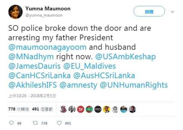 报道称,加尧姆的女儿穆蒙(Yumna Maumoon)在Twitter发文称,警方前往其位于首都马累的家中,破门入屋拘捕她的父亲及丈夫。文中没有进一步解释情况。