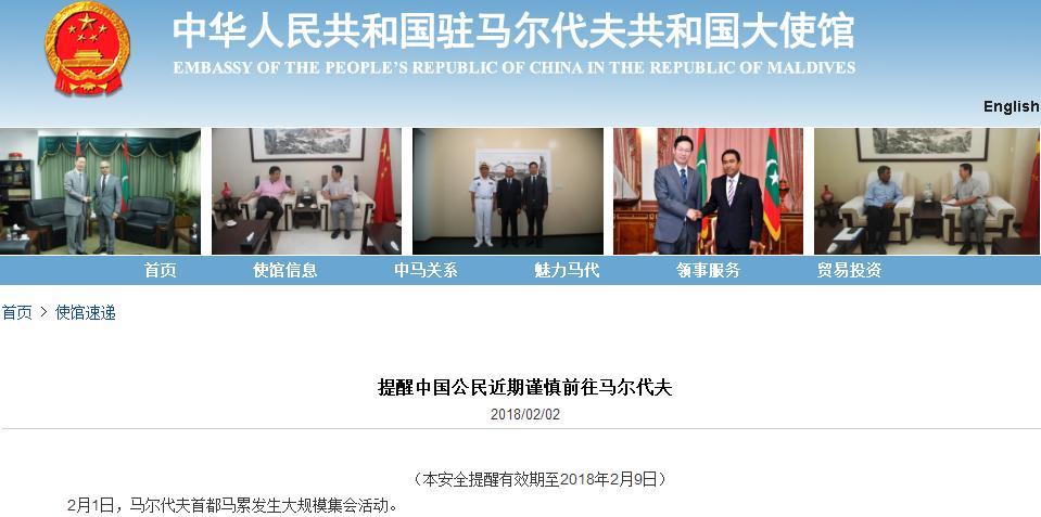 针对马尔代夫局势,中国驻马尔代夫使馆2月2日曾发布安全提醒。