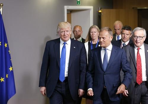 资料图:2017年5月25日,在比利时首都布鲁塞尔欧盟总部,到访的美国总统特朗普(前左一)与欧洲理事会主席图斯克(前中)和欧盟委员会主席容克(前右一)交谈。 新华社记者叶平凡摄