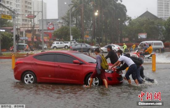 菲律宾民众顶着狂风暴雨出行。