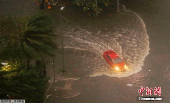 汽车在狂风暴雨中前行。