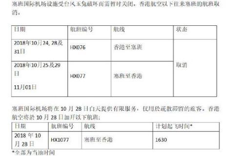 塞班国际机场设施受台风玉兔破坏而需暂时关闭。香港航空以下往来塞班的航班取消。塞班国际机场将在10月28日白天提供有限服务,仅用於疏散滞留的旅客。香港航空将於10月28日加开以下航班: