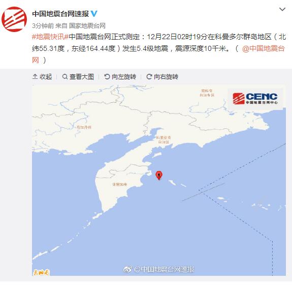 中新网12月22日电 中国地震台网正式测定:12月22日02时19分在科曼多尔群岛地区(北纬55.31度,东经164.44度)发生5.4级地震,震源深度10千米。