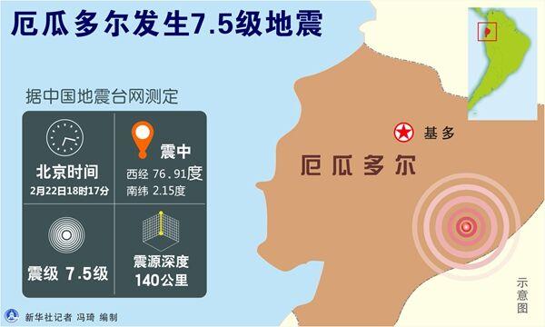新华社基多2月22日电(记者郝云甫)厄瓜多尔中南部地区22日发生7.5级地震,首都基多、第一大城市瓜亚基尔及多个省份均有震感。目前尚无人员伤亡和财产损失报告。