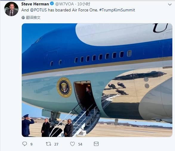 华盛顿时间25日中午,赫尔曼发布推特称,特朗普登上空军一号(Air Force One)。