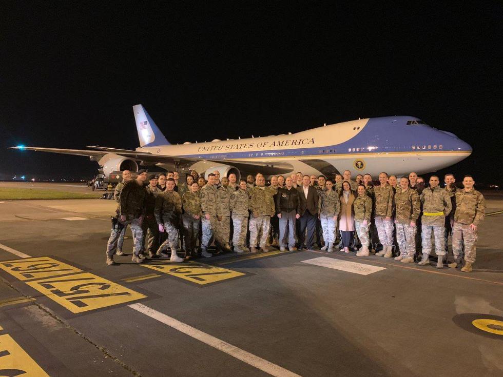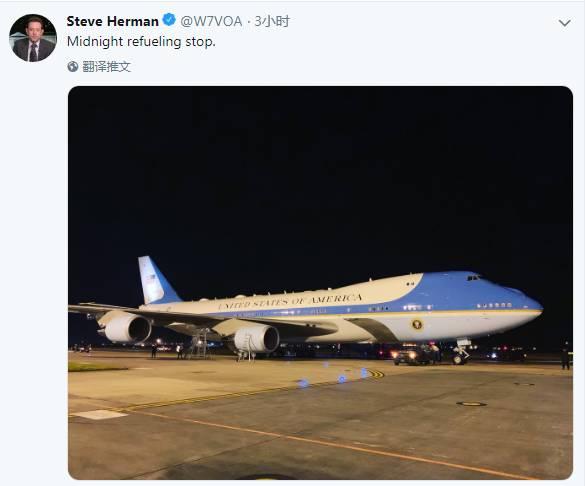 【环球网报道 记者 左甜】当地时间26日凌晨,美国总统特朗普专机降落在英国萨福克郡的米尔登霍尔皇家空军基地补充燃料。随行记者史蒂夫·赫尔曼在推特上直播了特朗普专机前往越南河内的经停全过程。