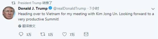当地时间25日下午,特朗普动身前发布推特称,“前往越南与金正恩会面。期待一次富有成效的峰会!”
