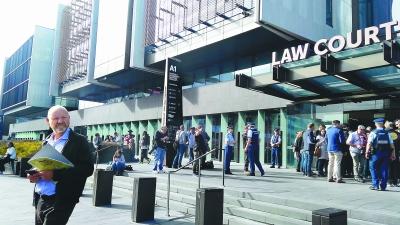 新西兰南岛克赖斯特彻奇清真寺枪击事件发生后,一名男性犯罪嫌疑人16日在当地出庭受审。图为记者在法院外等待。新华社发