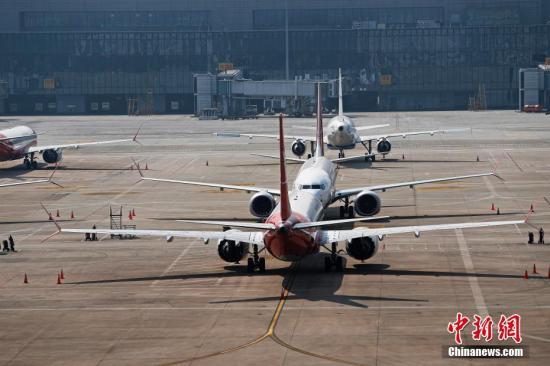 资料图:3月17日,上海航空公司的9架波音737MAX机型飞机停在虹桥国际机场停机坪上。目前,波音737MAX机型已经在全球停飞。中新社记者 殷立勤 摄