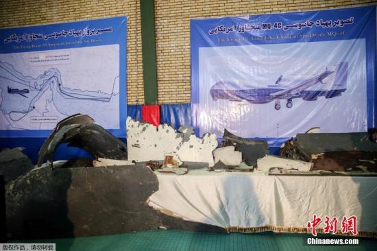 当地时间6月21日,伊朗德黑兰,伊朗革命卫队将本周四(20日)被击落的美国无人机碎片进行展示。