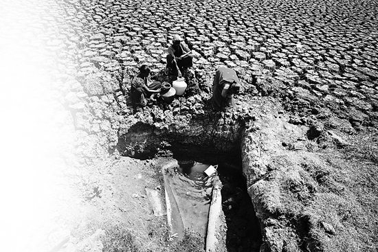 有时,人们奔波一天,只能在井底发现一滩污水。有时,找到一口污水都能令人满足。在本德尔汗德高地的主要河流肯河,一名孩童蜷缩起身子,侧躺在几近干涸的河床上,噘着嘴努力去喝浑黄的水,因为河水已浅到无法用手掬起。