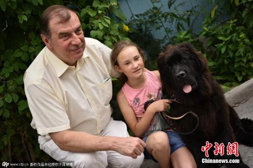 资料图:2015年7月,一个吉尔吉斯斯坦小女孩,收到普京赠送的一条纽芬兰犬。