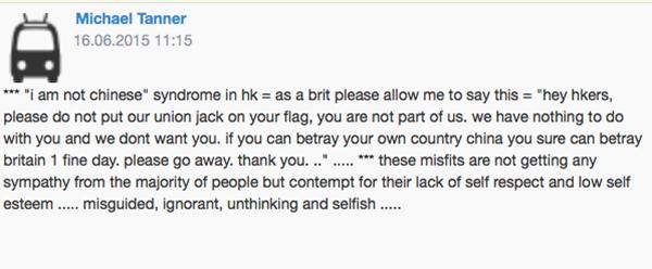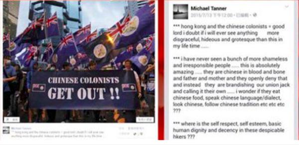 2014年“占中”事件发生后,一些港英分子持续拿英国国旗为自己壮胆,迈克尔·坦纳曾通过社交平台“脸书”发文说:“香港有种‘我不是中国人’综合征,作为一个英国人,请允许我这样说——你好香港人,请不要滥用我们的国旗标志,你们不是我们的一份子,我们跟你们没有任何关系,也不想有关系。如果你们可以背叛自己的祖国——中国,有一天你们肯定也会背叛英国。请走开,谢谢。”“这些不合群的(香港)人别想从多数人那里获得同情,大家只会蔑视他们缺乏自尊的行为……这些误入歧途、无知、愚昧、自私的人……”