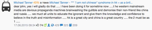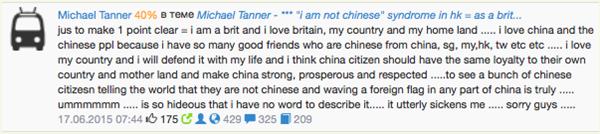 坦纳随后又发帖说:“我是一个英国人,我爱英国,我的祖国。我爱中国和中国人民,因为我有许多中国朋友,他们来自中国大陆、新加坡、马来西亚、(中国)香港、(中国)台湾,等等。我爱我的祖国,因而我会用我的生命去保护她。我想中国人民也会同样忠诚于他们的祖国,并使中国变得繁荣昌盛和受人尊敬。看着那一小撮中国人在中国的土地上挥动着外国国旗,喊叫着他们不是中国人,真是恶心到我了。”