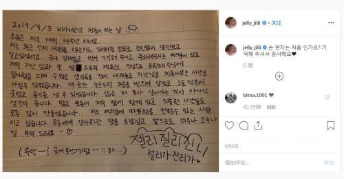 雪莉手写信。(图片来源:雪莉个人社交媒体账户)
