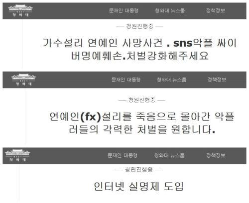 而韩国网友更是在青瓦台网站上,就雪莉死亡一事请愿,要求处罚“留下恶评、进行网络暴力导致雪莉死亡”的人们,敦促实行网络实名制等。